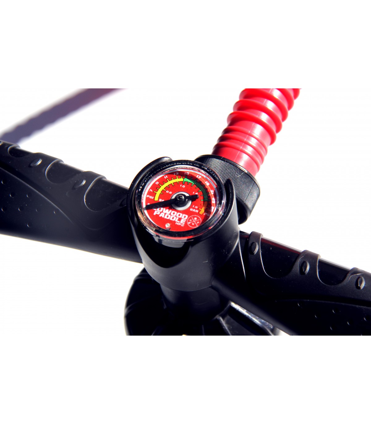 Inflador Destaque o novo insuflador HP com manómetro incorporado, duplo sistema de enchimento que permite inflar a prancha com velocidade dupla e aumentar a pressão do ar.